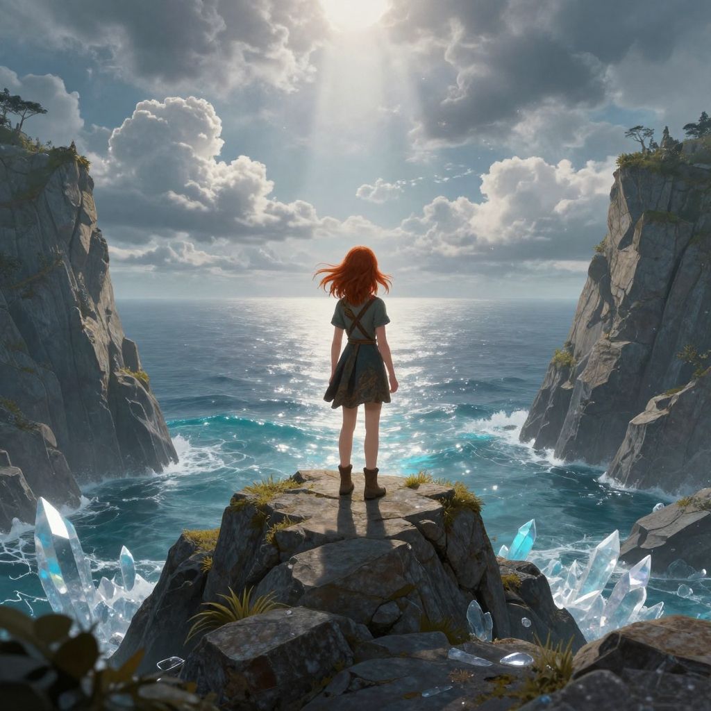 Digital artwork depicting a red-haired girl with a short black dress and white shirt, standing on a rocky cliff facing a sunlit ocean. She gazes towards a horizon where sunlight pierces through dramatic, cloudy skies. Surrounding her are jagged cliffs with patches of grass and glowing blue crystals emerging from the water. The ocean is vividly blue, with white waves crashing against the rocks. Her back is to the viewer, and her hair flows gently in the breeze. The scene combines elements of fantasy and adventure, with a focus on the natural beauty and mystical atmosphere.