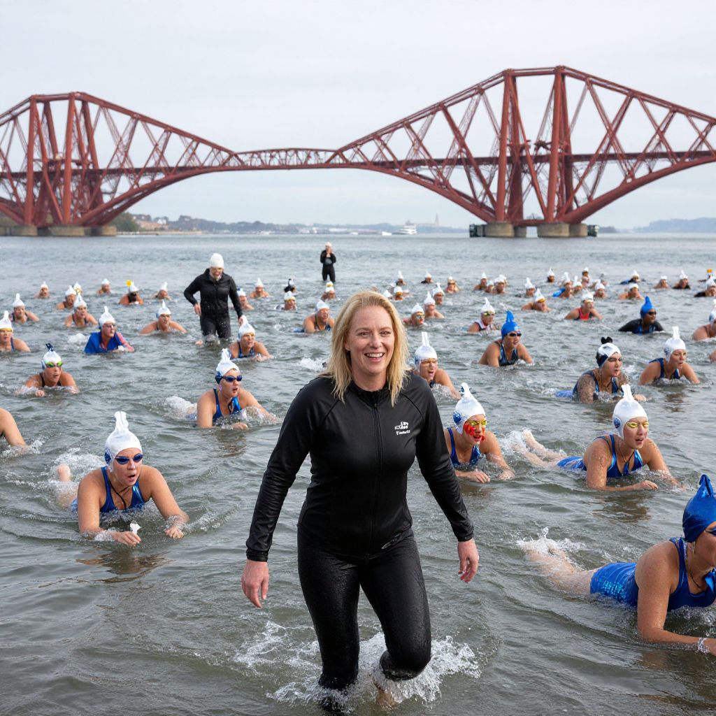 Photograph of a blonde woman in a black wetsuit standing in shallow water among swimmers in white caps, with a red bridge in the background