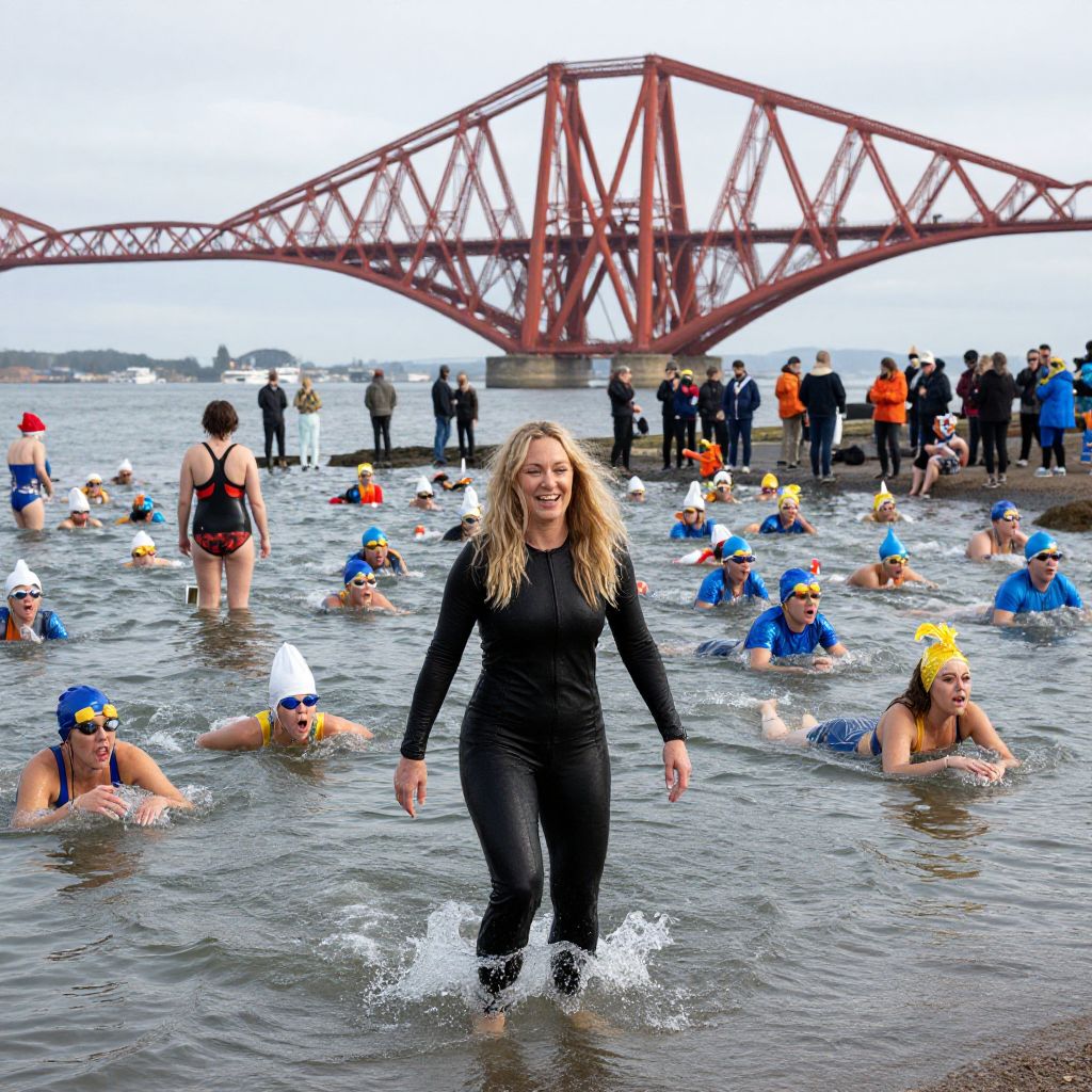 A woman smiles as she wades through the water as she joins around 1,000 New Year swimmers, many in costume, in front of the Forth Rail Bridge