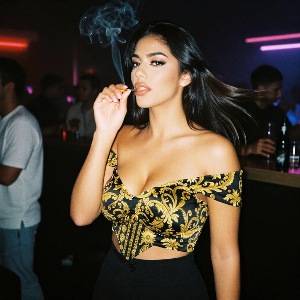 A woman, glam in an off-the-shoulder black top with gold baroque patterns and high-waisted pants, flowing hair, captured in the visual style of Eastman film stock, enjoying a vibrant evening at a nightclub smoking area. Sexy. Pretty face and beаutiful eyes. Big breasts