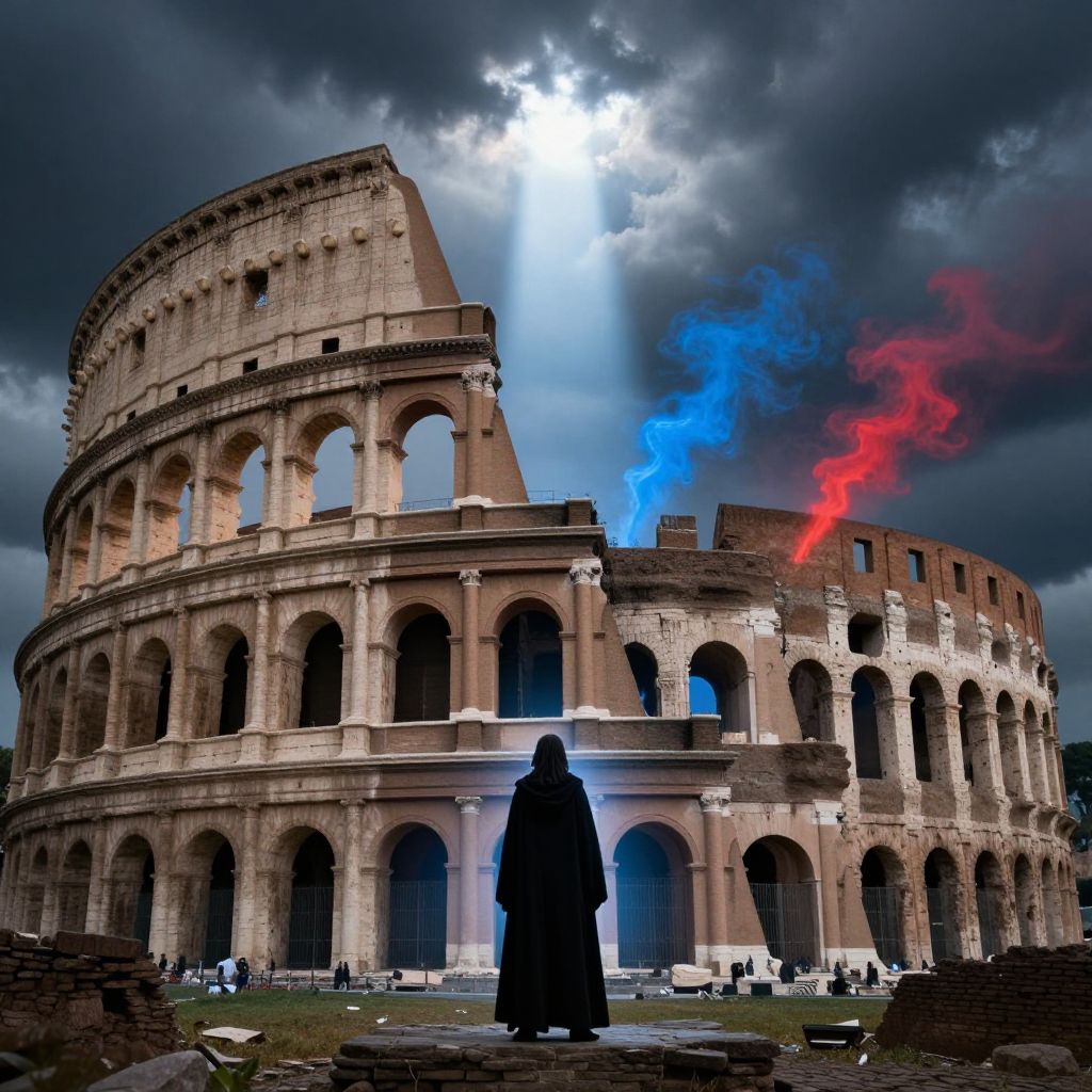 A grand, ancient Roman-style coliseum in the background, crumbling as neon blue and red smoke rises from its ruins, In the foreground, a cloaked figure stands alone, looking up at the collapsing symbol of human wisdom, as a divine light pierces through the dark clouds overhead, symbolizing the frustration of worldly intelligence