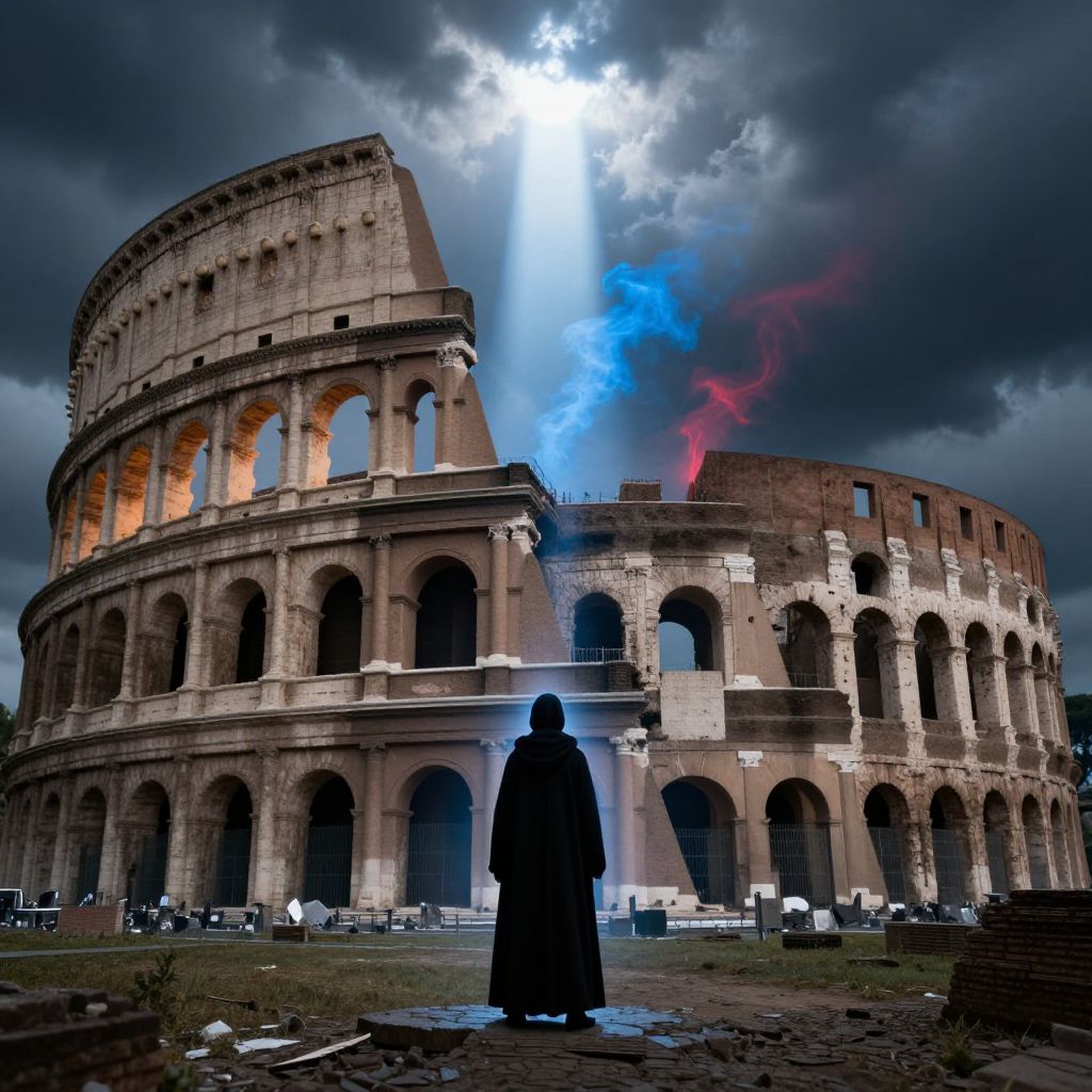 Photograph of a dramatic, nighttime scene featuring the ancient Roman Colosseum under a stormy sky. A lone, silhouetted figure stands in the foreground, facing the Colosseum. The structure's weathered stone arches and windows are illuminated by a bright, ethereal light breaking through the clouds, creating a stark contrast with the dark sky. Blue and red smoke plumes rise from the right side of the Colosseum, adding a sense of mystery and intrigue. Debris and rubble are scattered on the ground in front of the Colosseum, enhancing the scene's historic and abandoned atmosphere.