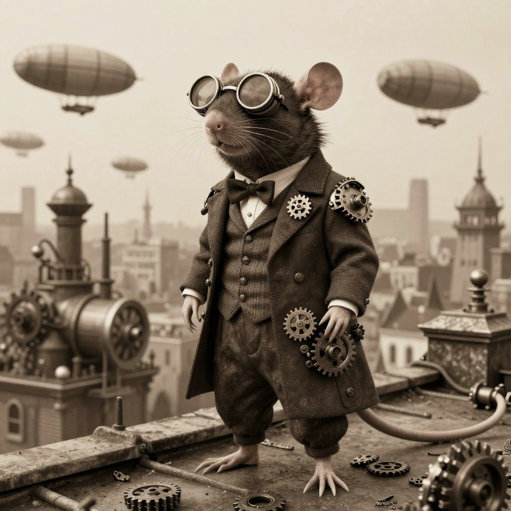 A steampunk inspired rat with round wireframe glasses, gears and mechanical elements around, high contrast lighting, detailed fur, futuristic and vintage fusion, dark moody background, cinematic style.