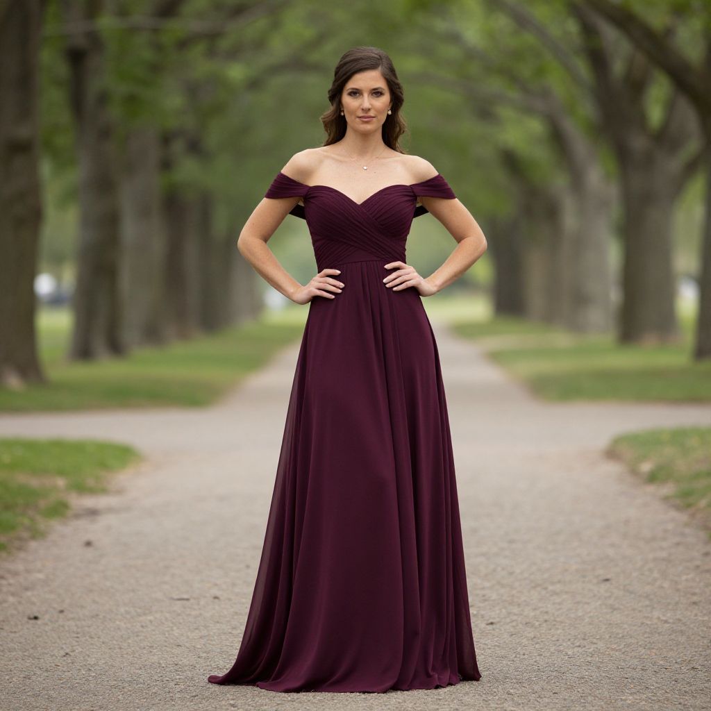 Photograph of a tall, fair-skinned woman with dark brown, wavy hair standing on a tree-lined pathway in a park. She wears an off-the-shoulder, deep purple, floor-length evening gown with a fitted bodice and a flowing skirt. Her hands rest on her hips, and she gazes confidently forward. The background features a blurred view of tall trees and a gravel path, with patches of green grass on either side. The overall scene is serene and elegant, emphasizing her formal attire and poised stance.