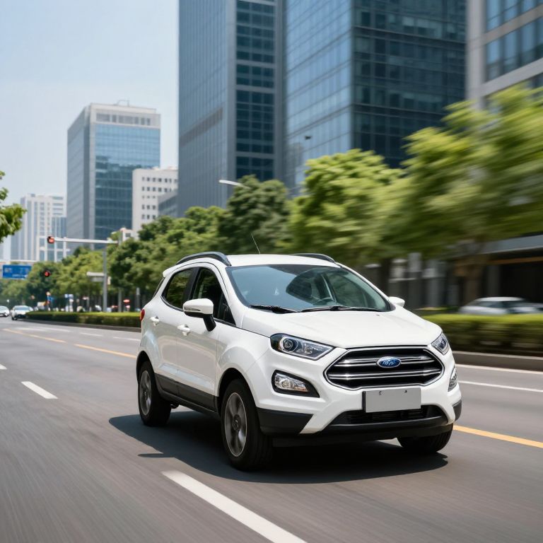White 2020 Ford EcoSport speeding along a sunlit urban street, flanked by tall glass skyscrapers and lush green trees, its sleek design and modern grille prominently displayed as it moves away from the cityscape.