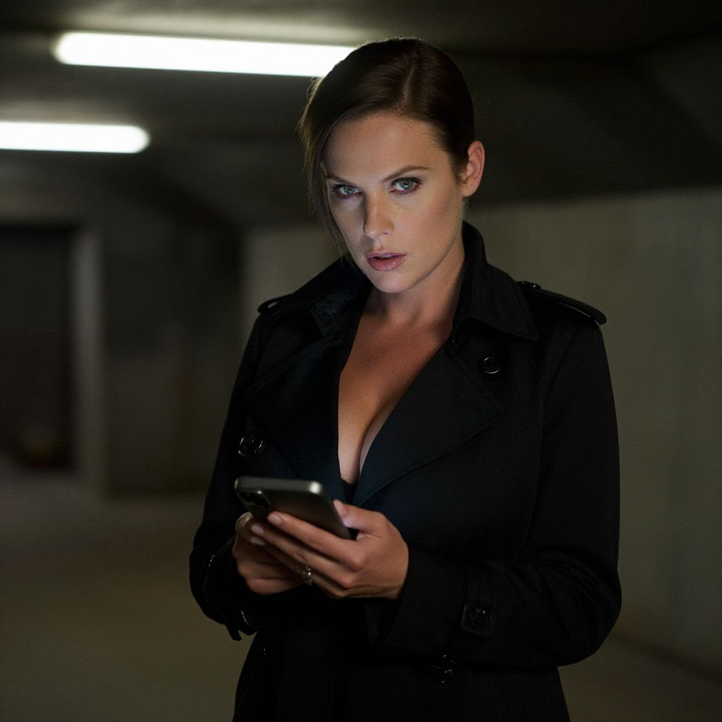 A stylish spy thriller woman in her late 30s with sharp features, high cheekbones, and piercing green eyes, standing in a dimly lit underground bunker, wearing a sleek black trench coat that subtly hides her intensity and a hint of concealed weaponry, soft shadows highlighting her focused expression as she examines a encrypted device under flickering fluorescent lights.. The woman has big tits and cute face