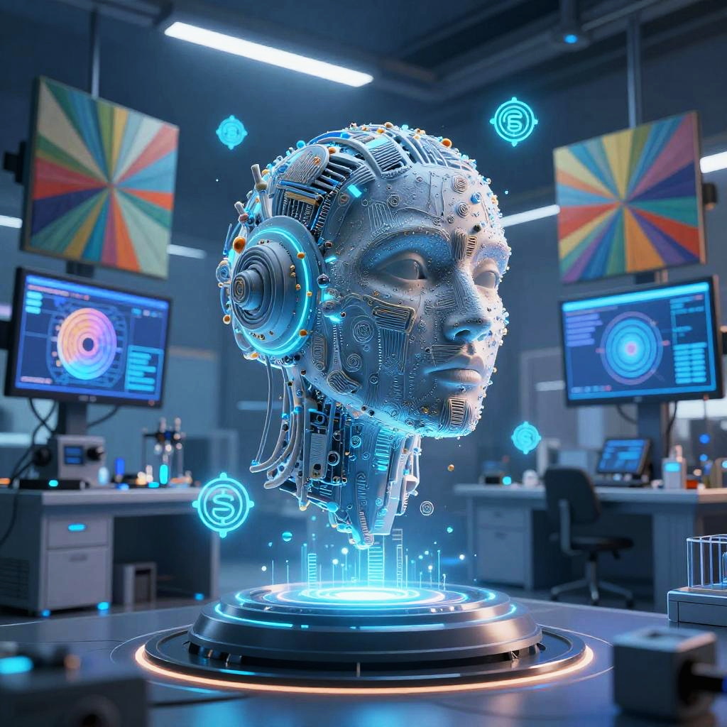 Ai image generate visualization of an advanced artificial intelligence inside a digital art laboratory, surrounded by multiple screens displaying vivid abstract paintings and 3D models, cool blue lighting and glowing data symbols, dynamic and highly detailed sci-fi atmosphere
