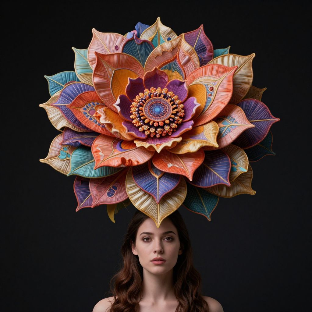 A vibrant, fantastical flower towers over a woman's head, with intricate petals and a variety of vibrant colors.