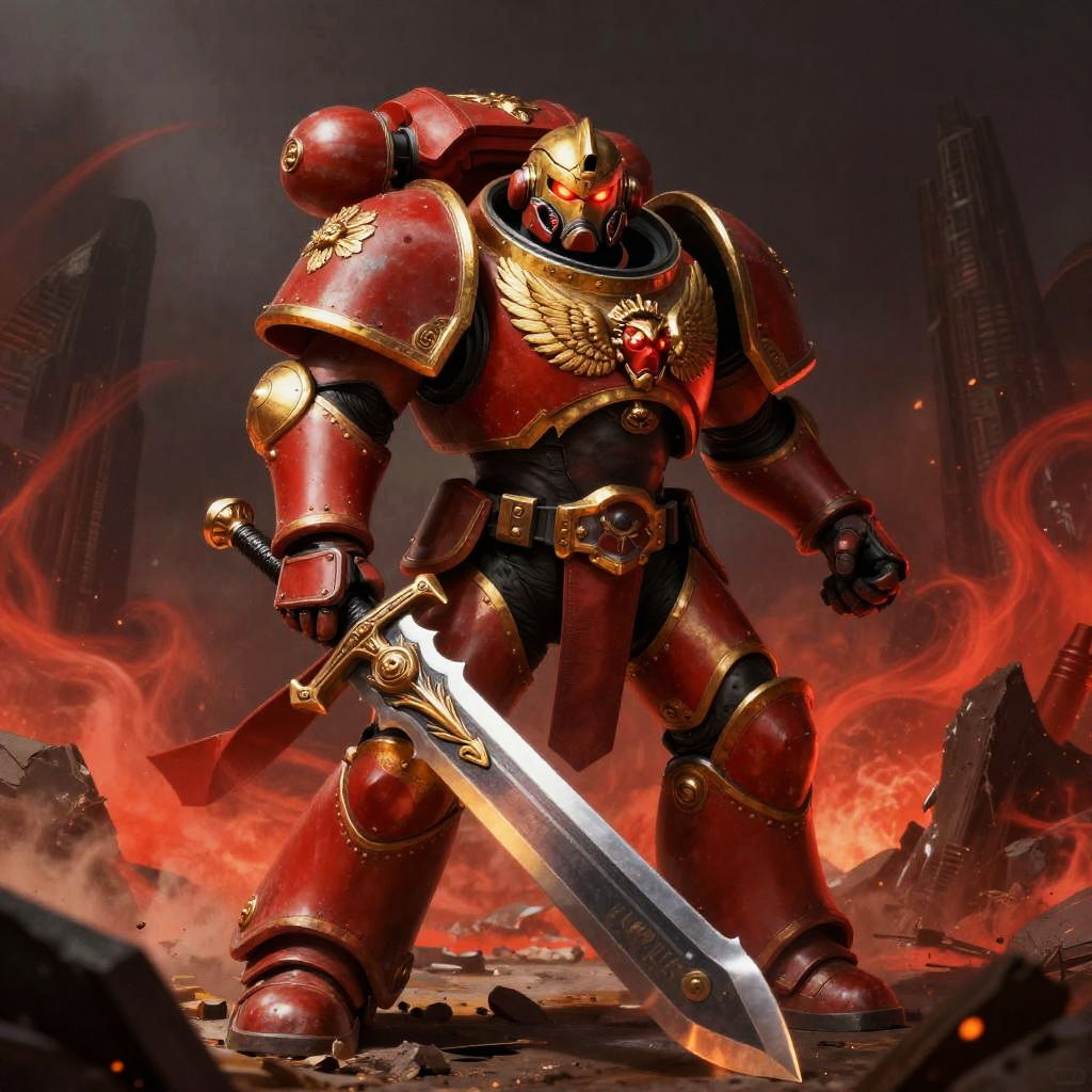Blood Angels artwork featuring an armored space marine with ornate gold and red armor, angelic motifs and glowing eyes, clutching a massive chainsword, surrounded by swirling red mist and embers, set against a war-torn landscape in a futuristic sci-fi style.