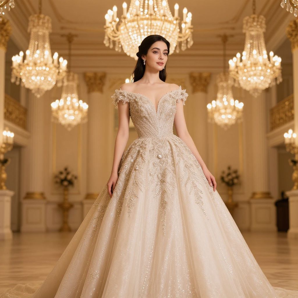 Elegant bride showcasing a voluminous, ivory wedding gown with intricate lace detailing, puffed sleeves, and a flowing veil, walking down a grand hallway lined with seated guests under warm, ambient lighting.