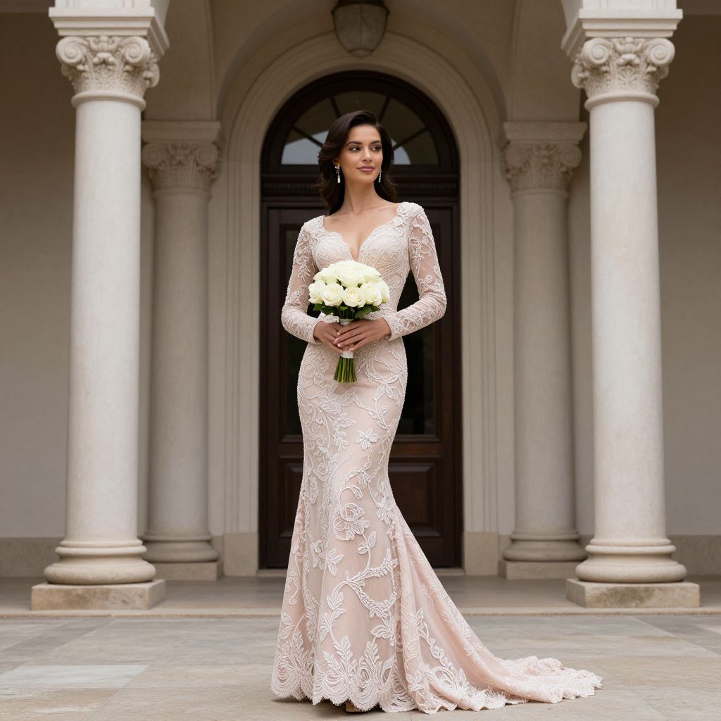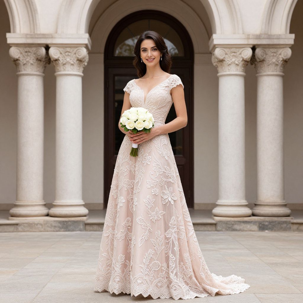 Elegantly poised woman in a blush pink lace gown with intricate floral embroidery, holding a bouquet of white roses, stands gracefully against a backdrop of classical architecture featuring three ornate columns and a grand arched doorway.