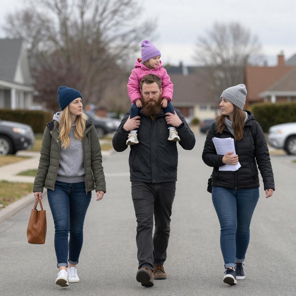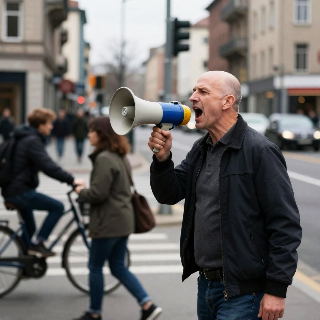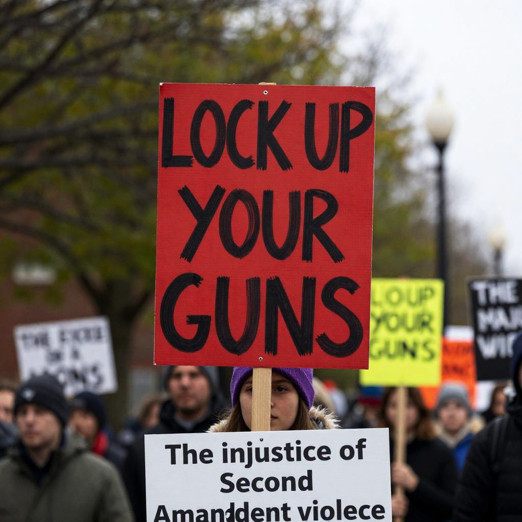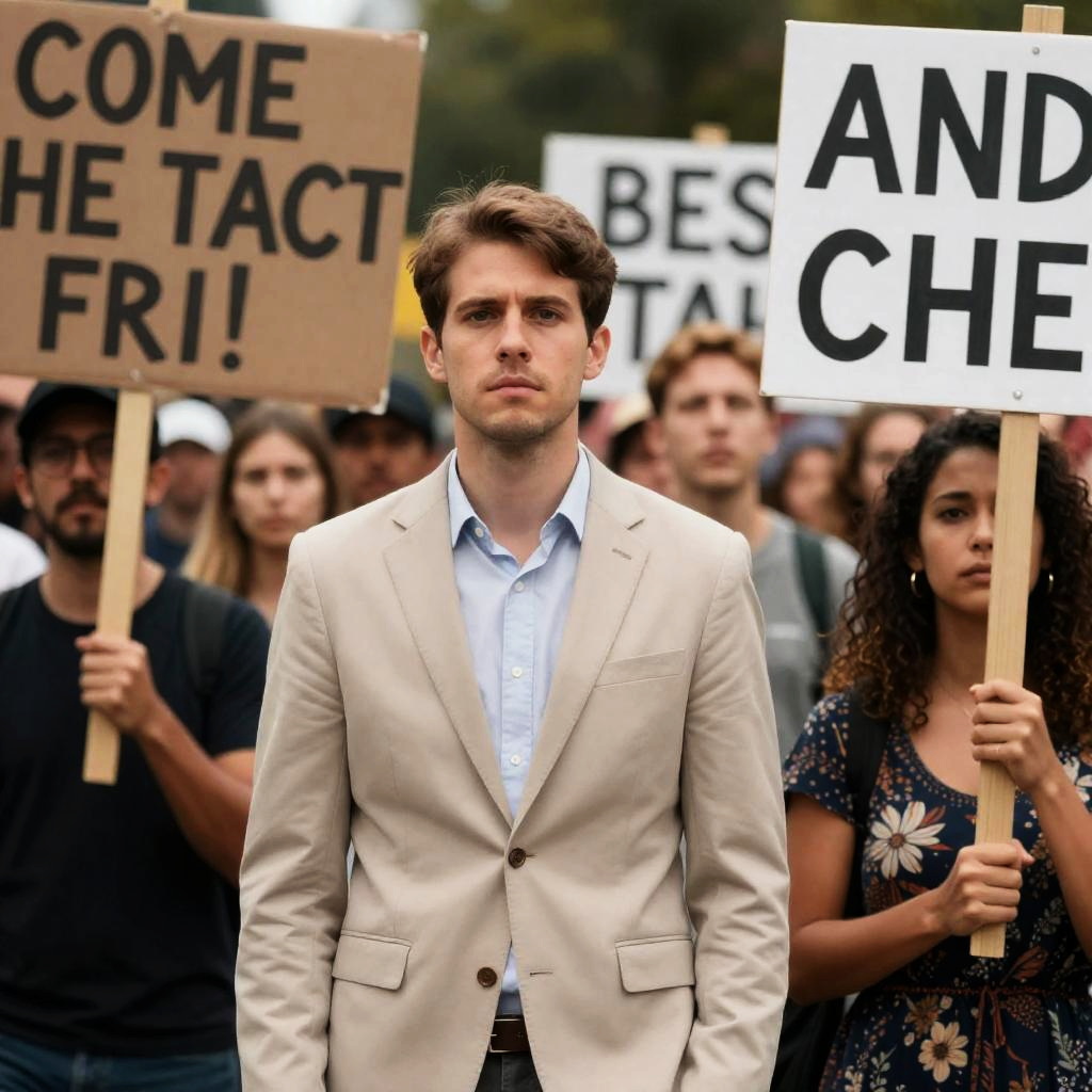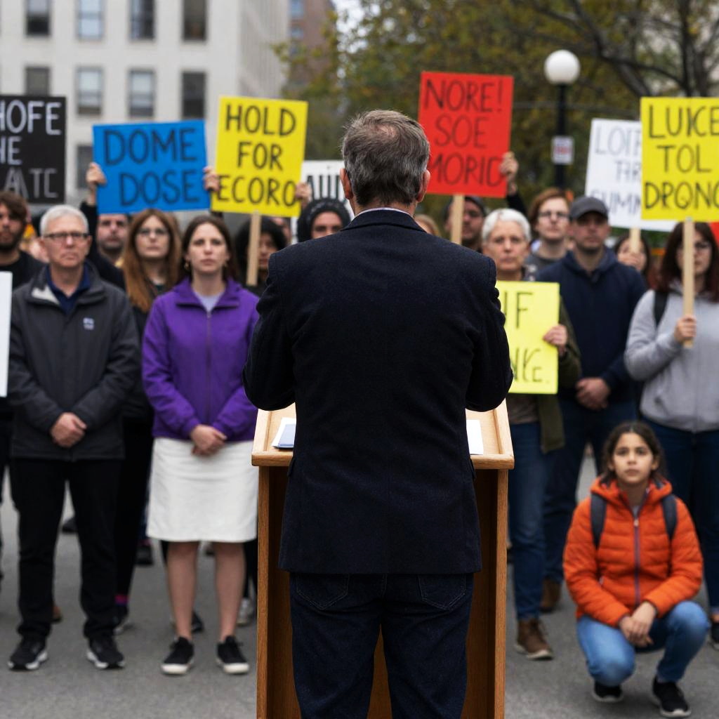 Photograph of a protest. Central figure, with back to camera, stands behind a wooden podium. Crowd of diverse individuals holds colorful protest signs. Woman in purple jacket and white skirt stands in front. Young girl in orange jacket kneels. Background includes city building and trees. Intense expressions on faces. About 15 people in the crowd.
