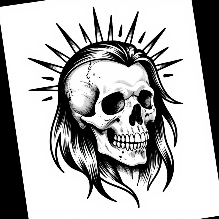 A striking black-and-white line drawing tattoo design featuring a detailed skull with exaggerated features, long hair, and radiant spikes emanating from its head, showcasing a bold and edgy artistic style reminiscent of modern tattoo artistry.