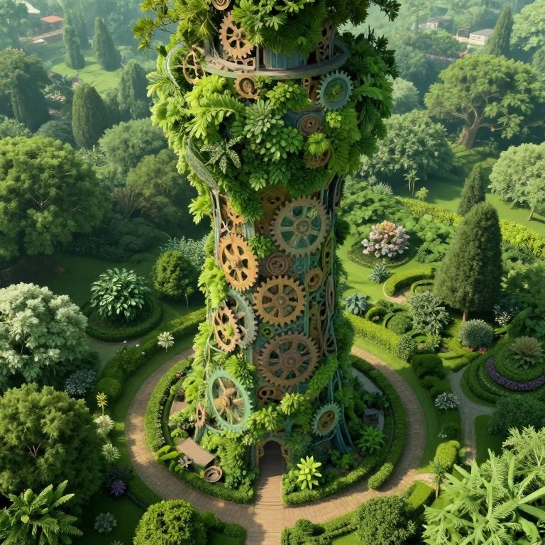 A mesmerizing digital artwork captures the essence of surreal landscapes with an enchanting scene where an oversized tower emerges from a verdant, overgrown garden. The peculiar structure merges seamlessly with the surrounding flora, revealing intricate gears and cogs through translucent foliage when viewed from above. This whimsical, dreamlike environment evokes a sense of wonder and intrigue as it invites the viewer to explore its mysterious depths.