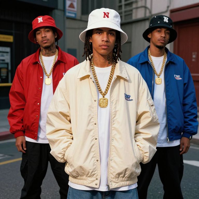 Vanilla ice outfits inspired by 90s hip-hop fashion, featuring oversized jackets, bucket hats, gold chains, and vibrant colors in an urban street setting, dynamic lighting highlighting textures and fabrics.