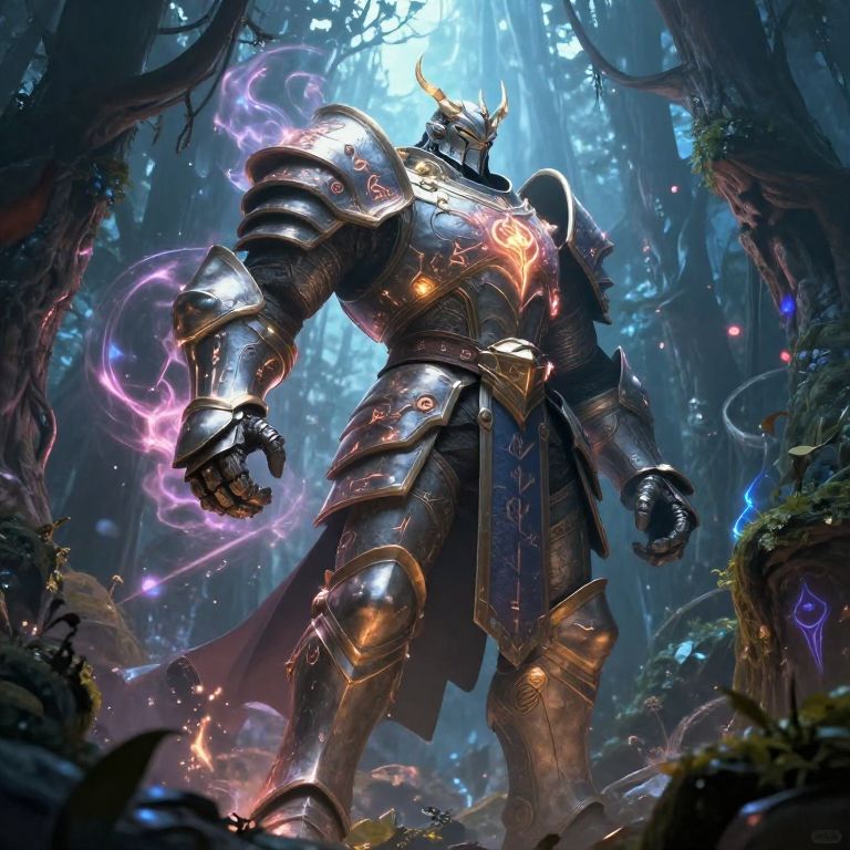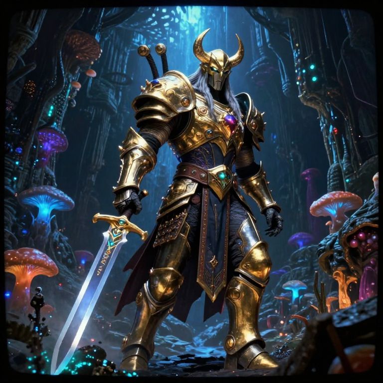 Digital fantasy artwork of a muscular, armored warrior with a horned helmet, standing in a mystical forest. He wears gleaming gold armor with intricate designs and holds a glowing blue sword in his right hand. A purple gem is embedded in his chest plate. The background features glowing mushrooms, bioluminescent plants, and a blue luminescent light source above. The forest is dark, with a mix of purple, blue, and orange hues. The warrior's stance is powerful and commanding, with his left hand resting on his hip. The overall style is highly detailed and vibrant, evoking a magical, otherworldly atmosphere.