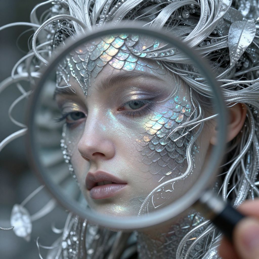 Craft an evocative digital artwork in a distinctive style, portraying a surreal close-up of a woman with skin shimmering like iridescent scales. Her visage is partially hidden by flowing tendrils of silver foliage, creating an enchanting fusion between her and the natural world around her. The perspective should be unconventional, as if seen through a magnifying lens, emphasizing the intricate textures and patterns on her skin that seamlessly blend with their surroundings, evoking a sense of intrigue and ethereal allure in this mesmerizing portrayal of enigma and beauty.