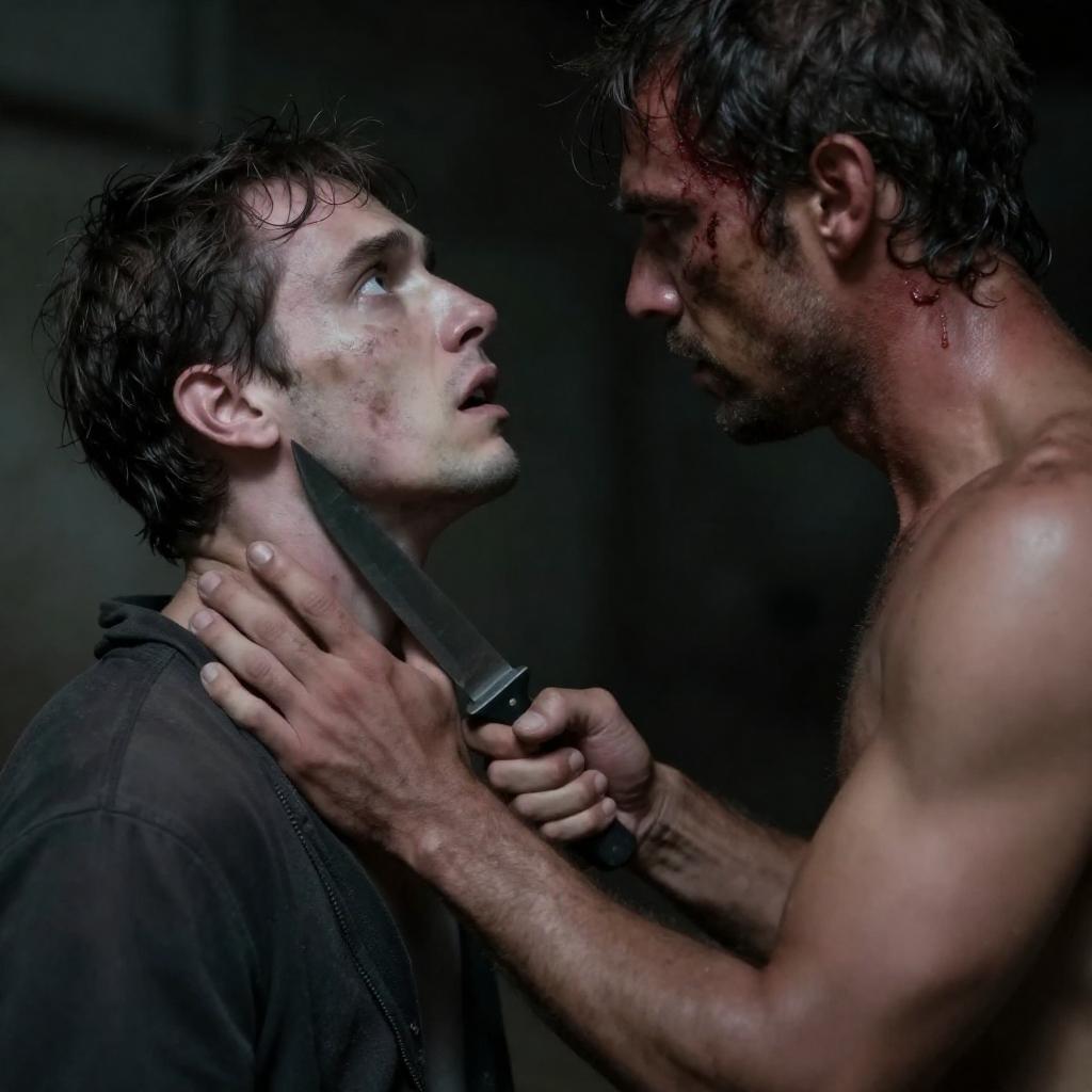 Photograph of a tense scene: a dirty, muscular man with wild hair and blood on his face holds a knife to the neck of a scared, pale man with short hair, who looks up with wide eyes. The background is dark and blurry, emphasizing the confrontation. The man holding the knife is shirtless, while the other wears a dark garment.