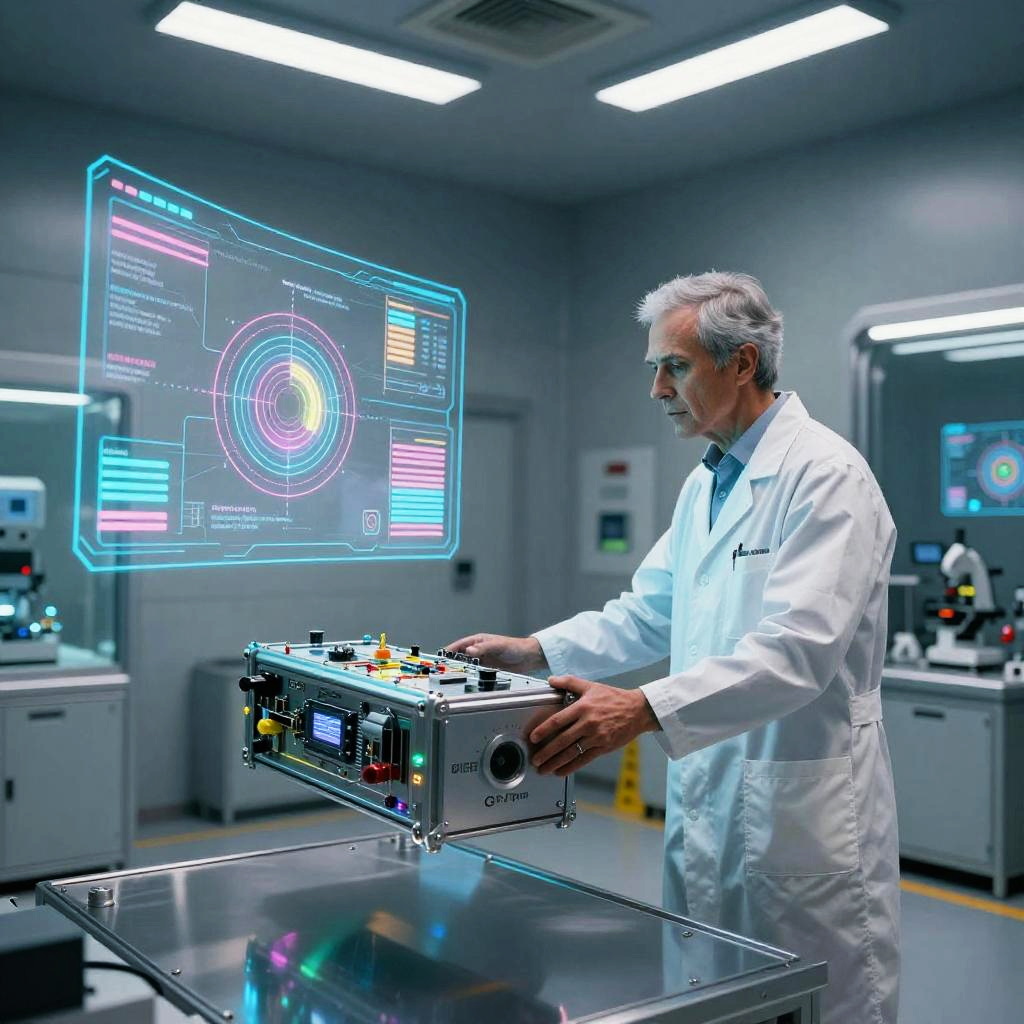 Hyperboard floating above a metallic desk in a high-tech lab, blue and silver color scheme, intricate circuitry patterns, sci-fi ambiance with soft ambient lighting, realistic style