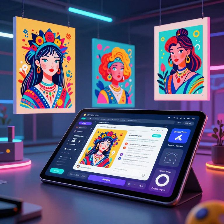 Digital artwork gallery: vibrant portraits of three women with colorful headdresses, displayed on glowing screens, illuminated by neon lights, with a stylized tablet showing