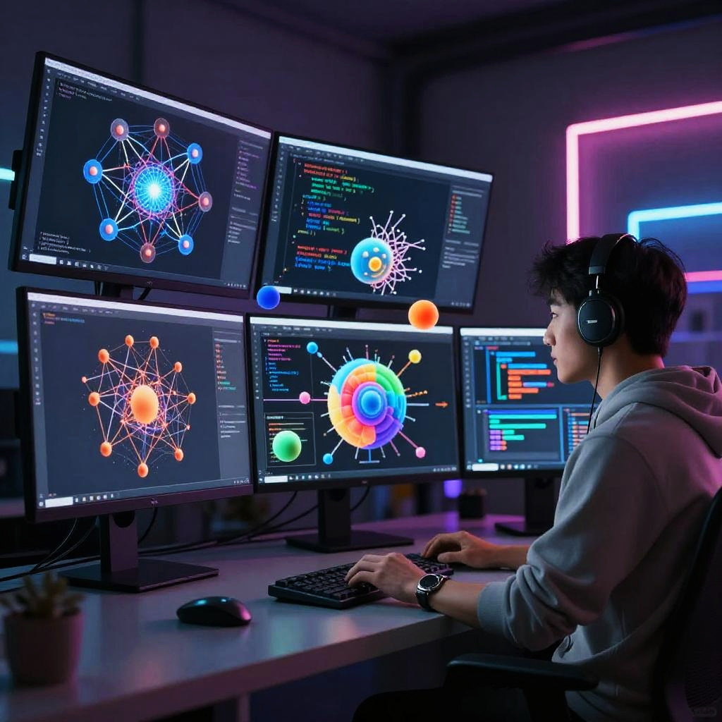 Free AI image generator concept in a sleek, modern workspace, neon lights reflecting on high-tech computers, AI algorithms generating stunning art on large screens, a blend of human creativity and artificial intelligence in a dynamic and colorful setting.