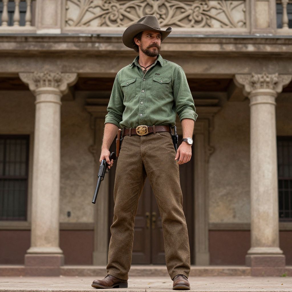 Photograph of a bearded man in his 30s, wearing a dark brown cowboy hat, green button-up shirt, brown pants, and brown boots. He holds a black revolver in his right hand and has a watch on his left wrist. A gold-buckled belt with a sheriff's badge is visible. He stands in front of an old, ornate Western-style building with two columns and decorative stonework above the entrance. The background features a weathered, beige facade and barred windows. The image has a slightly desaturated, cinematic quality.