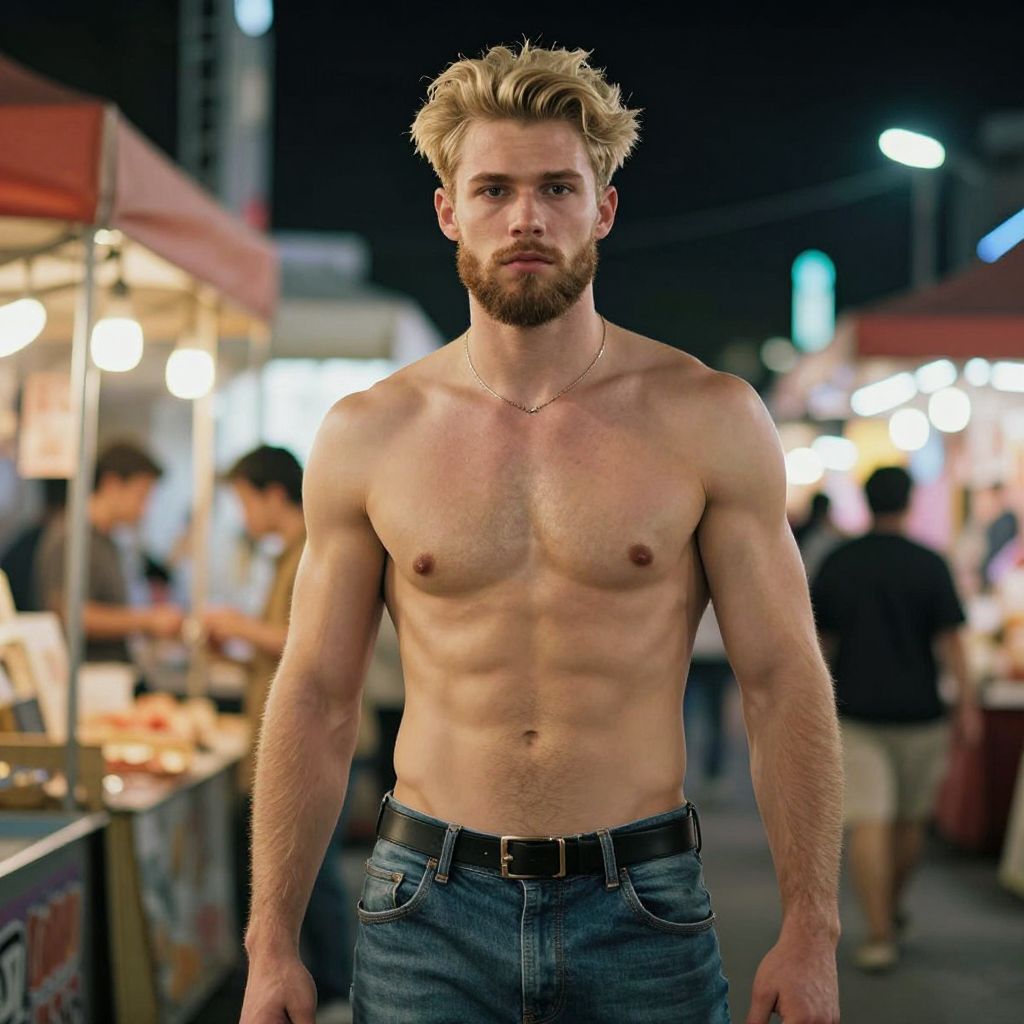 Photograph of a tall, muscular, Caucasian man with light brown, wavy hair and a full beard, standing shirtless on a nighttime street market. He wears blue jeans with a black belt, and a thin gold necklace. His defined chest and abs are visible, with a slight tan. The background features blurred market stalls with red and white canopies, bright lights, and several people, including a man in a dark shirt and khaki shorts, walking away. The scene is lively, with a mix of warm and cool tones.
