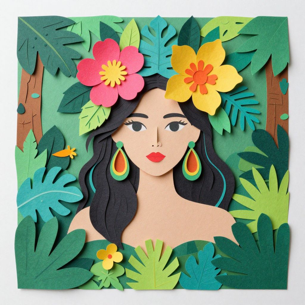 A hyper-detailed, vividly colored woman in a tropical jungle, adorned with large, colorful flowers and leaves, with a studio lighting effect, reminiscent of Yulia Brodskaya's paper art style.