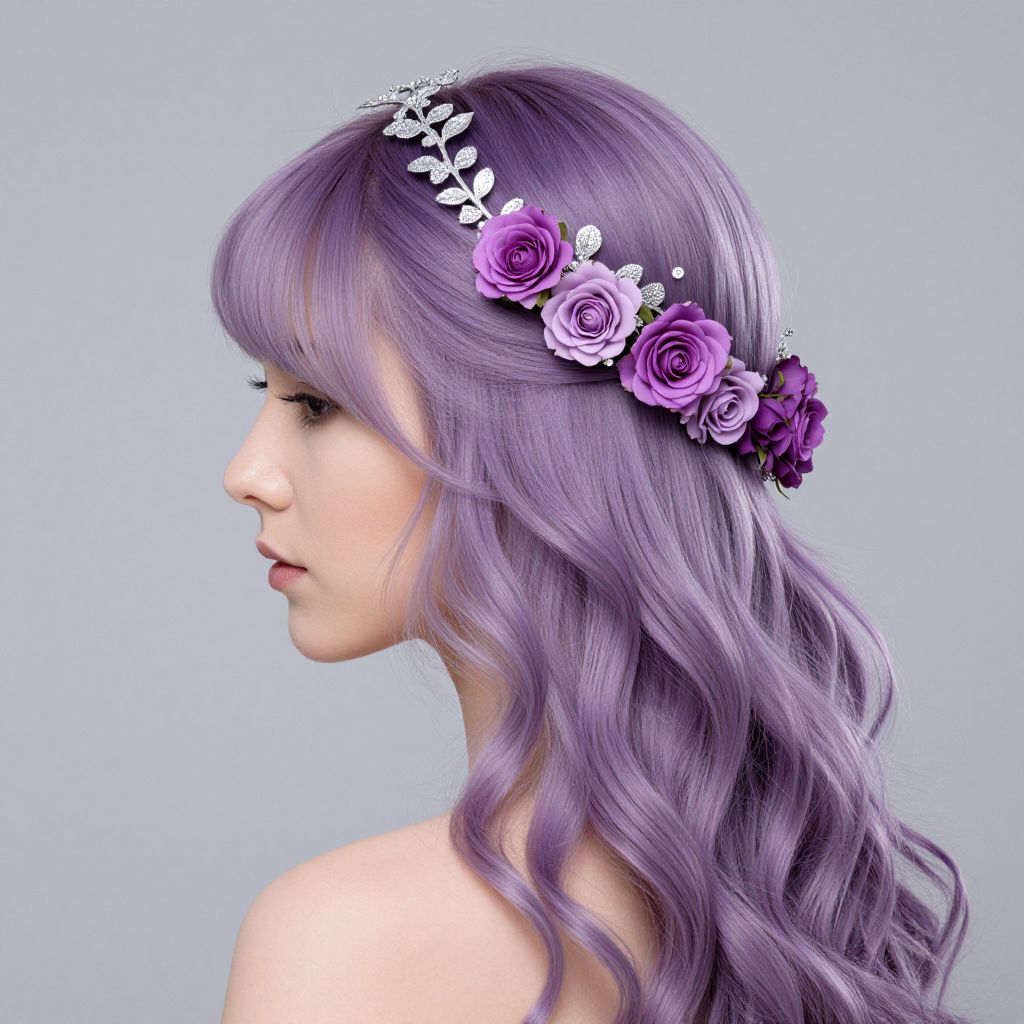 Elegant profile of a woman with cascading lavender hair adorned by a delicate silver leaf bridal hair vine intertwined with clusters of vibrant lilac roses, set against a soft gray backdrop.