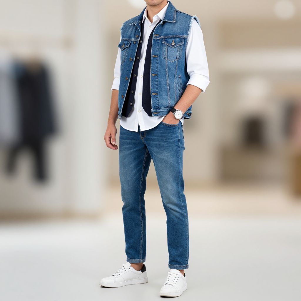 Photograph of a man from the neck down wearing a white dress shirt with rolled-up sleeves, a blue denim vest, and blue jeans with slight distressing. He has a black necktie loosely hanging and white sneakers with perforations. His right hand is in his pocket, and he wears a white wristwatch on his left wrist. The background is blurred, featuring soft, bright lighting and indistinct clothing racks, suggesting a store setting. The overall style is casual yet stylish, with a mix of classic and modern elements.