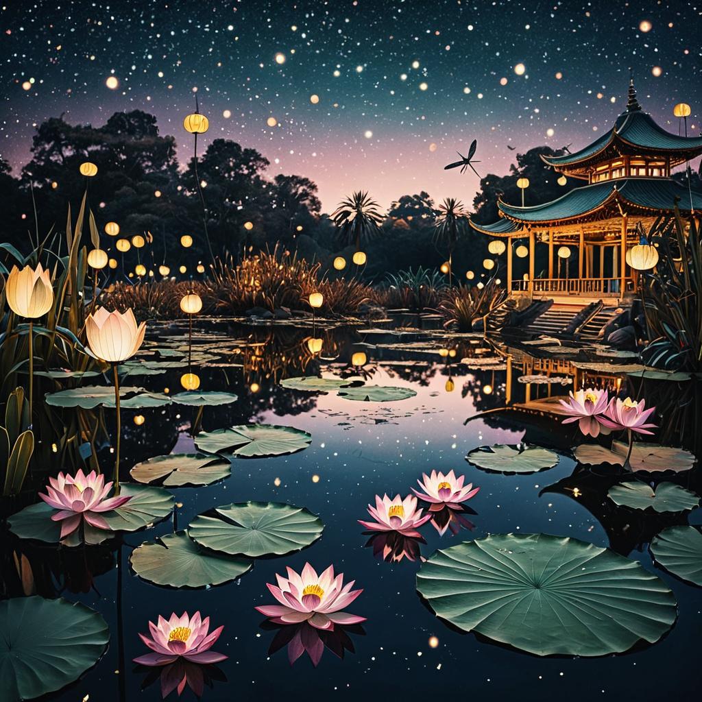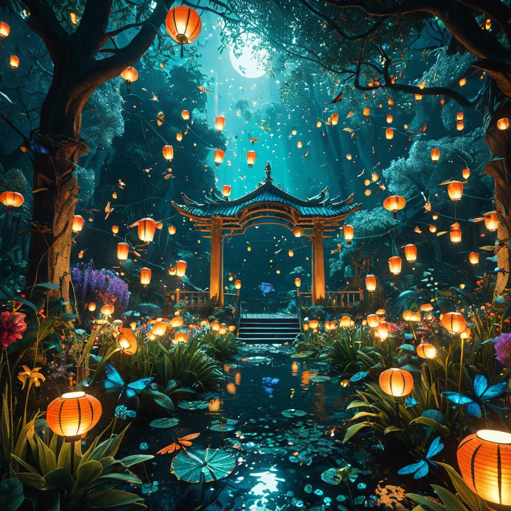 A fantastical mythical garden illuminated by numerous glowing floating lanterns and vibrant butterflies. The garden features lush vegetation, reflective water with lily pads, and an ornate traditional Asian-style pavilion under a bright full moon. The scene is artistically inspired, with captivating lighting and vibrant colors enhancing the whimsical atmosphere.