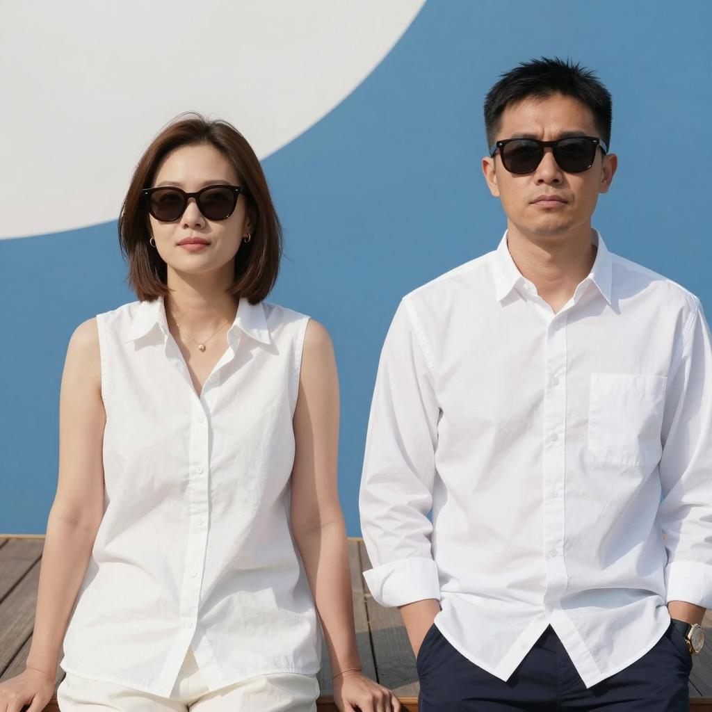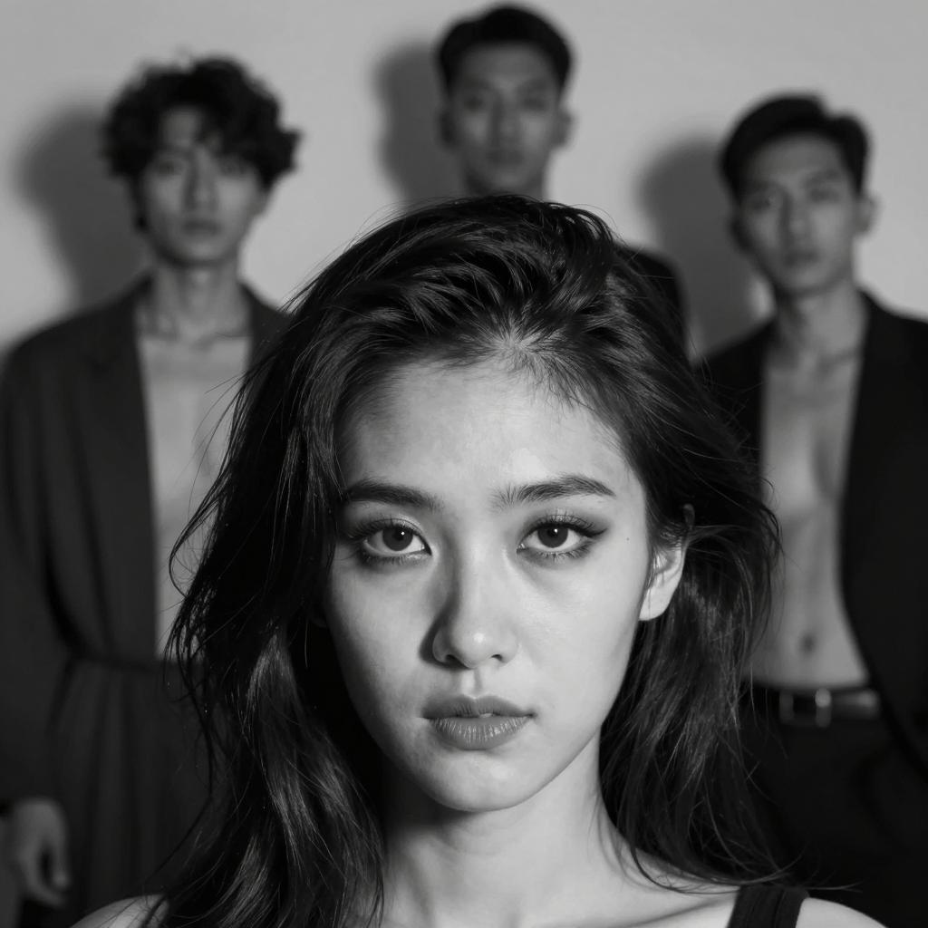 Black and white close-up portrait of an Asian man and woman. The man has short, slicked-back hair and wears a white shirt, looking intently forward. The woman has shoulder-length wavy hair, small earrings, and also wears a white shirt, leaning her head gently on the man's cheek with a calm expression. The plain white background emphasizes the intimate and minimalistic composition.