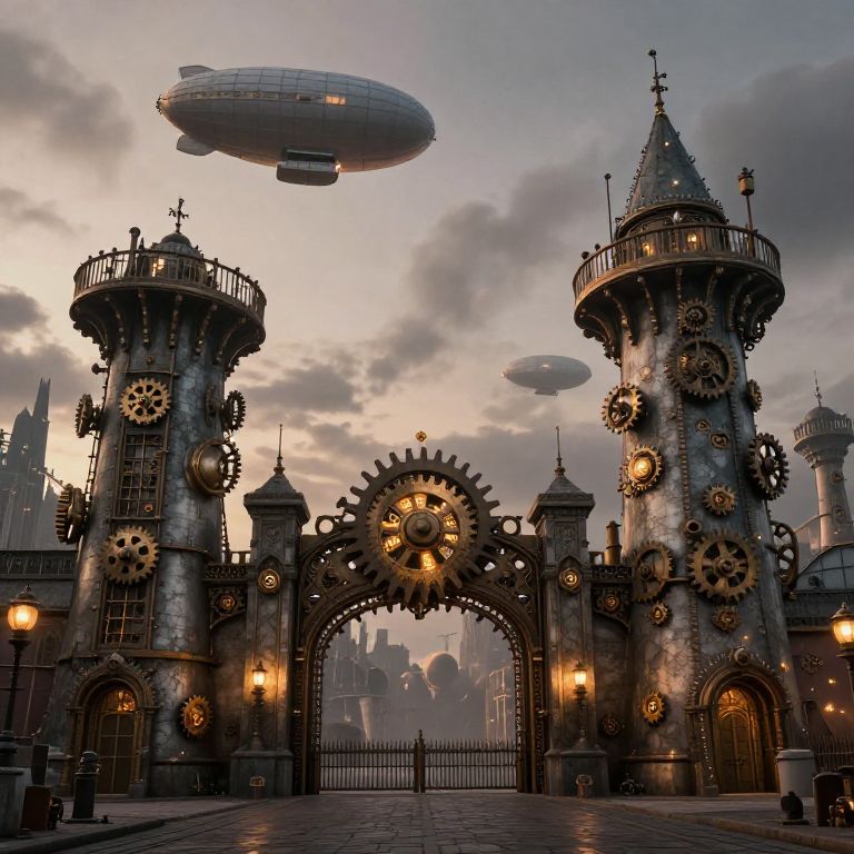 Steampunk-style gatehouse with clockwork gears, two towers, and airships in a cloudy sky at dusk. Gothic architecture and glowing lanterns