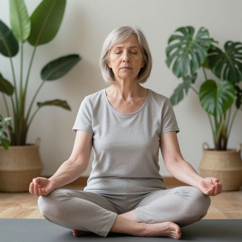 Senior woman meditating serenely in a tranquil indoor setting, surrounded by lush green plants and soft natural light, embodying the calming practice of mindfulness meditation.