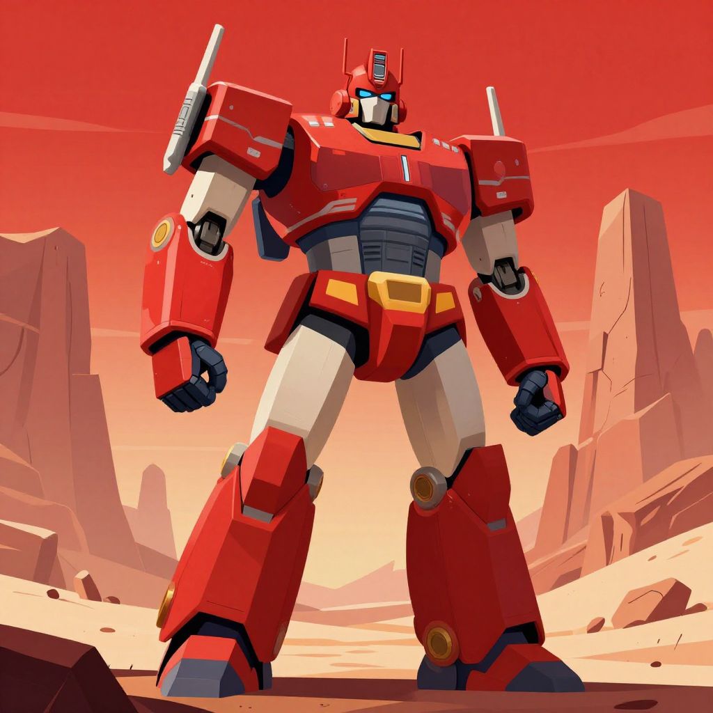 Digital illustration of a large, red, humanoid robot standing in a rocky, desert-like landscape. The robot has a muscular build with white and black armor plating, and is equipped with large, angular shoulder armor, a chest plate, and thick, blocky legs. Its hands are clenched into fists, and it has a silver head with a single, prominent antenna and blue eyes. The background features tall, jagged rock formations under a vibrant, red-orange sky. The robot's design is reminiscent of classic 1980s Transformers, with bold, clean lines and a dynamic, heroic pose.