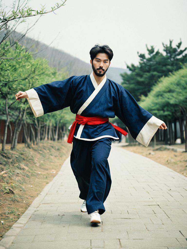 Korean Man in Traditional Hanbok Outdoors