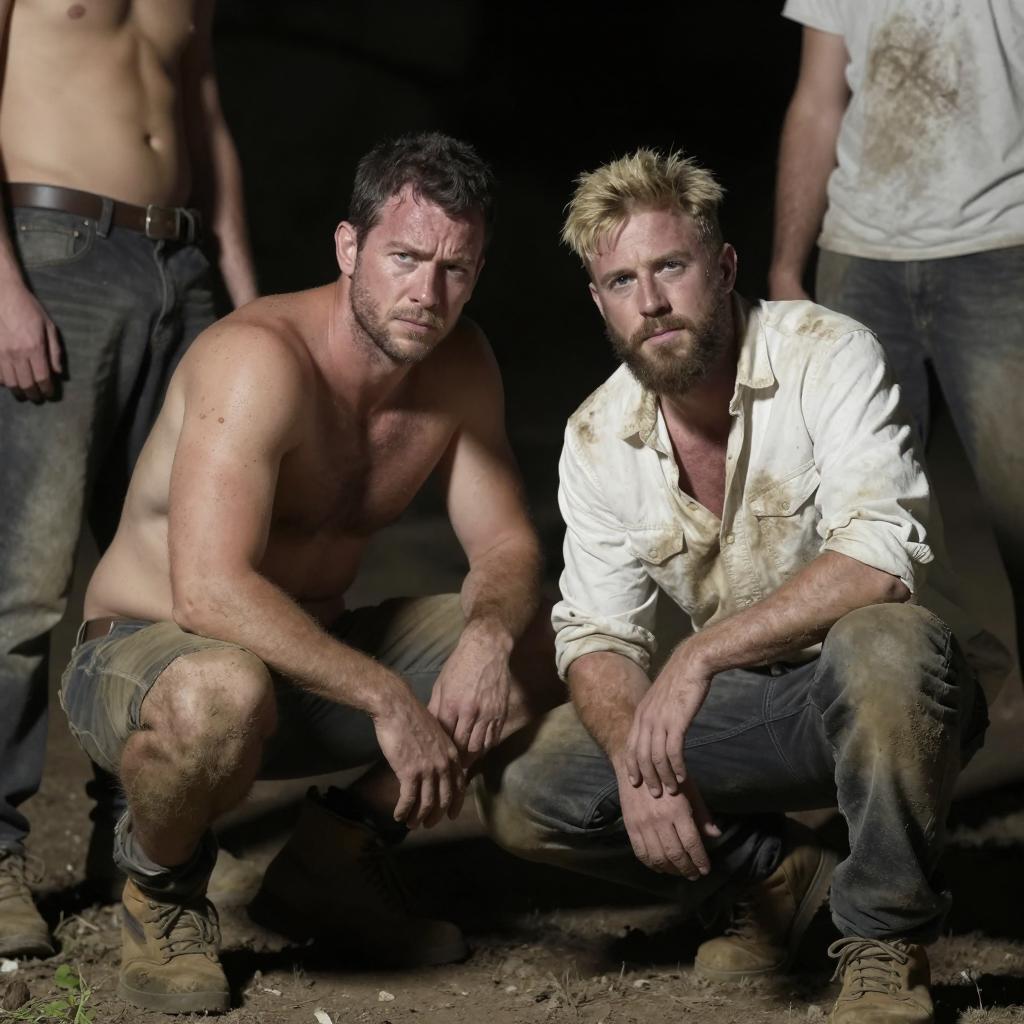 Photograph of five men with intense expressions, standing closely together. Men have rugged appearances, disheveled hair, and various facial hair. Front man with glasses, red hair, open shirt. Second man shirtless, muscular. Third man serious, dark hair. Fourth man serious, short dark hair. Fifth man partially visible. Dimly lit background. Casual, worn clothing. Foreground man in beige t-shirt. Group poses closely.
