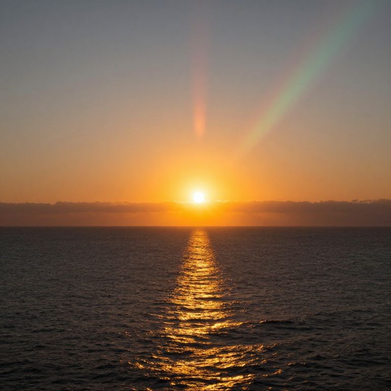 A radiant sun defies gravity, sinking into the ocean's mirror-like surface, its fiery reflection transforming into a cascading shower of golden particles, while vibrant rainbow beams pierce the twilight sky above.