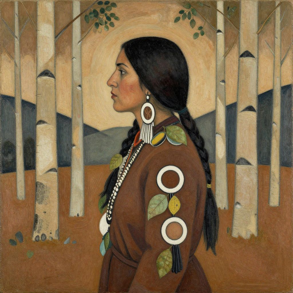 A Native American woman in profile, adorned with sacred circles and leaves, stands amidst aspen trees in earthy tones, reminiscent of Georges Braque's style.