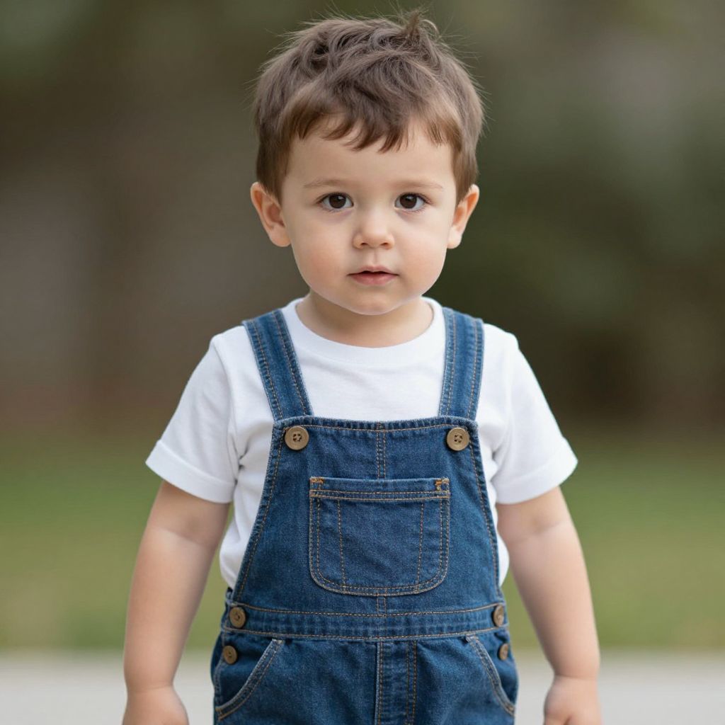 Photograph of a young boy standing outdoors. He has short, dark brown hair and large, dark brown eyes. He wears a white t-shirt underneath blue denim overalls with brown buttons. The overalls have a front pocket. The background is blurred with green and brown hues, suggesting a grassy, outdoor setting. The boy's expression is neutral, and he stands with his hands by his sides. The image has a soft focus, emphasizing the boy's face and clothing.