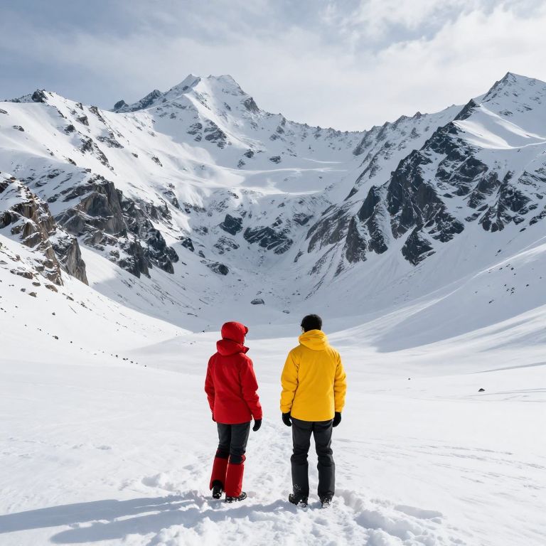 Two individuals dressed in vibrant red and yellow winter jackets stand amidst a vast expanse of snow, framed by towering snow-covered mountains and a serene alpine landscape in Marain Skmlia.