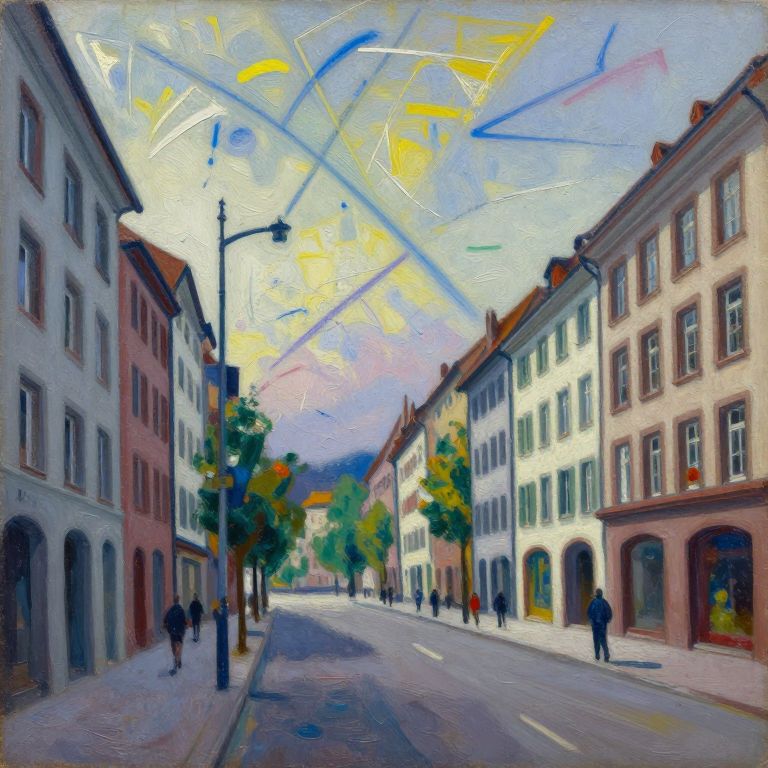 Wide-Angle Action Shots city of basel, in the style of wassily kandinsky Schnittlinien, oil on canvas,
