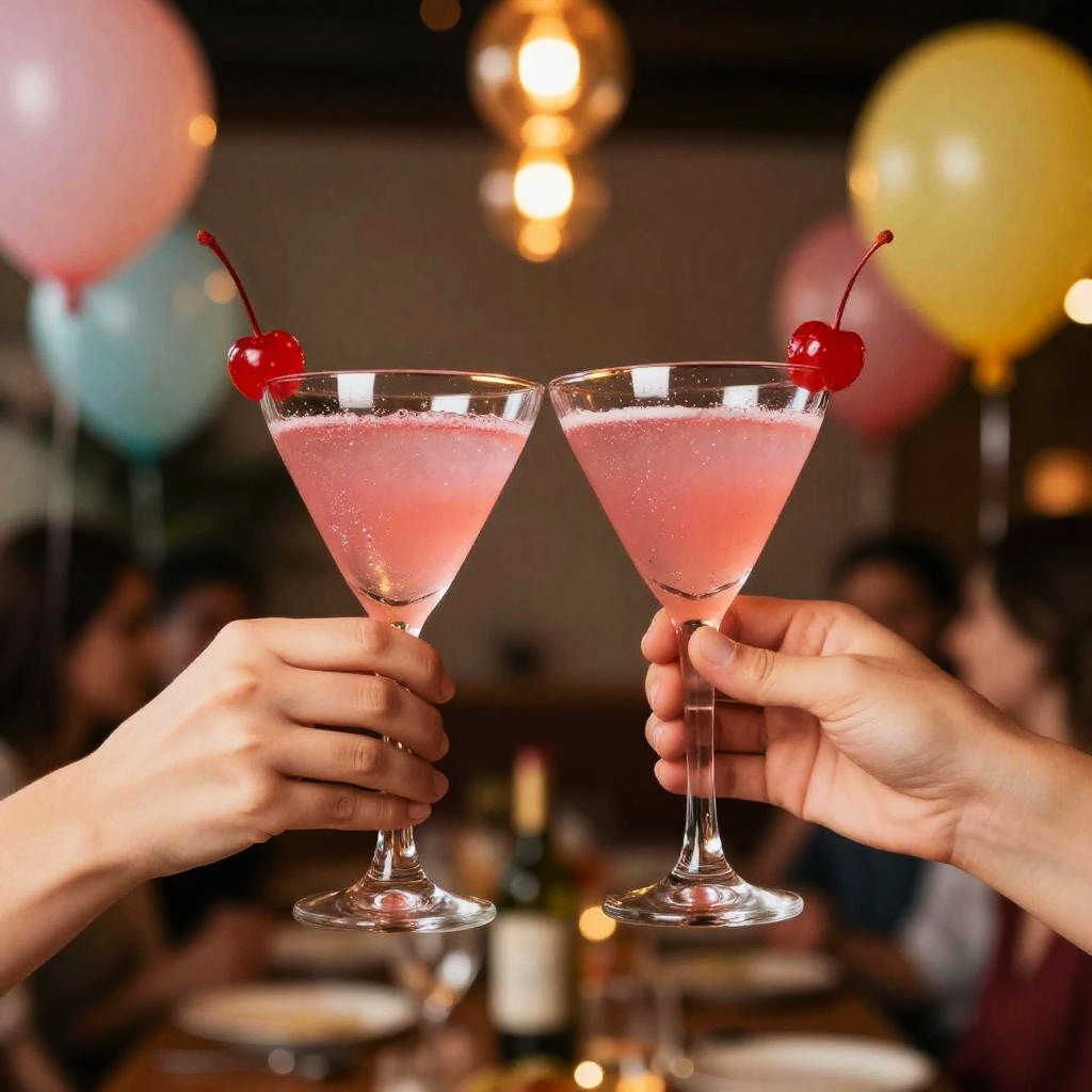 A vibrant photo of two hands clinking pink cocktail glasses, each with a cherry on top. The background is blurred but features warm, glowing lights and colorful balloons, creating a festive, party atmosphere. The hands are positioned in the center, with the glasses held at eye level, highlighting the sparkling drinks and adding a sense of celebration.