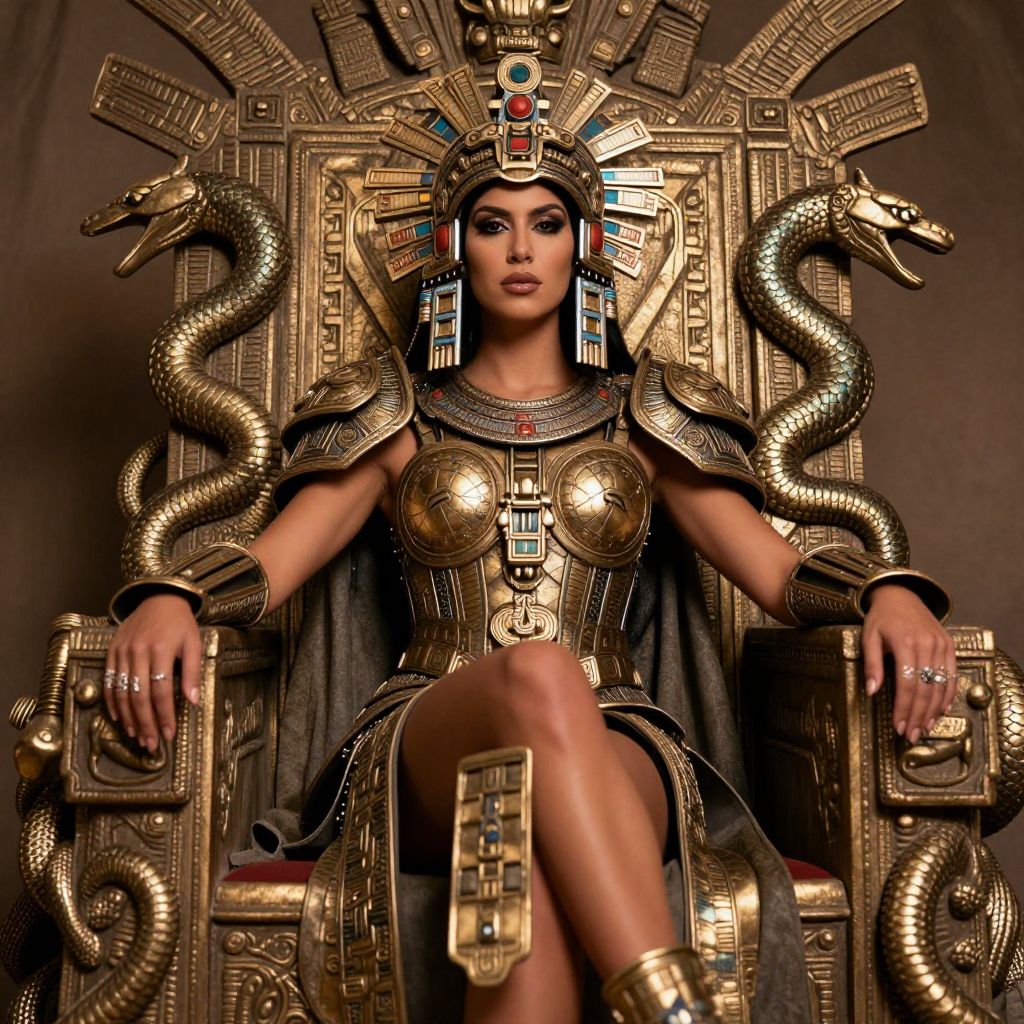 Photograph of a regal woman with bronze armor and snake-headed throne, wearing a headdress with colorful gems, seated confidently.