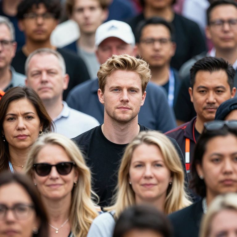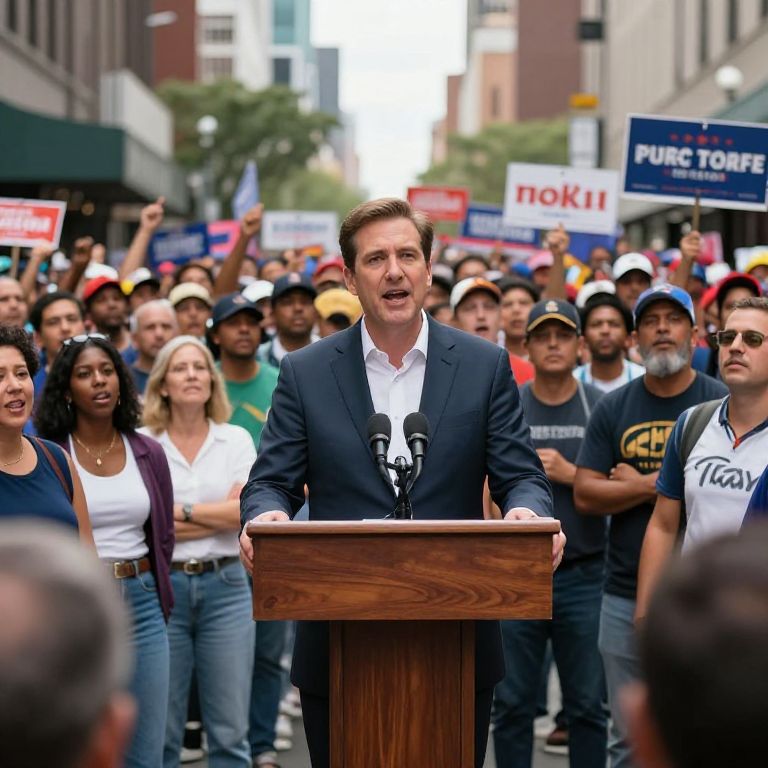 Sports Slender male, brown hair, politician, sleeves rolled to elbow, stump speech, crowd, positive, sunlight from left to right, in a park, tree in background, artwork by Joe Shuster,