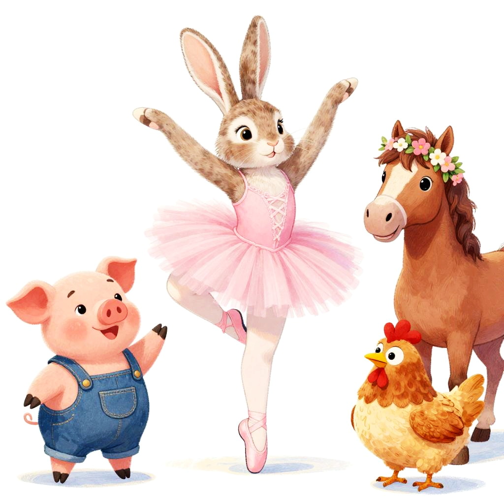 A whimsical and colorful illustration of Benny the Rabbit in a pink tulle tutu and ballet slippers, standing on her hind legs with her arms extended as if she’s dancing ballet. Her friends, a piglet in denim overalls, a pony with a flower garland, and a speckled hen wearing a tiny bow, are watching her in awe.