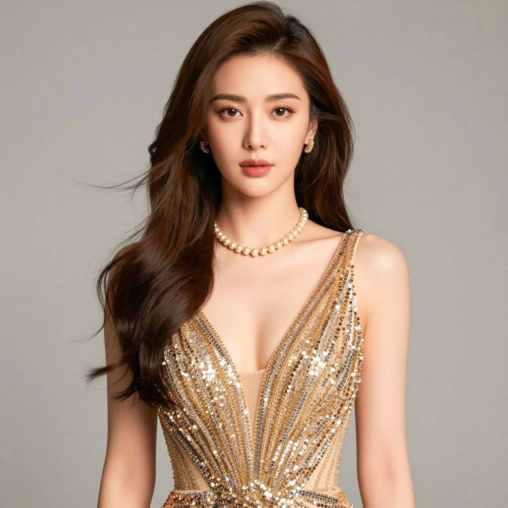 Portrait of an elegant East Asian woman with long black hair, wearing a red off-shoulder satin dress and gold hoop earrings. She is holding a glass of pink wine in her right hand and looking down at it with a slight smile. The background is blurred with muted gray tones.