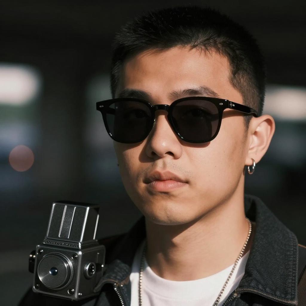 GigaChad wearing wayfarer sunglasses, square jaw, hasselblad, candypunk, bokeh, hyperrealistic, dramatic lighting, art by photohelper