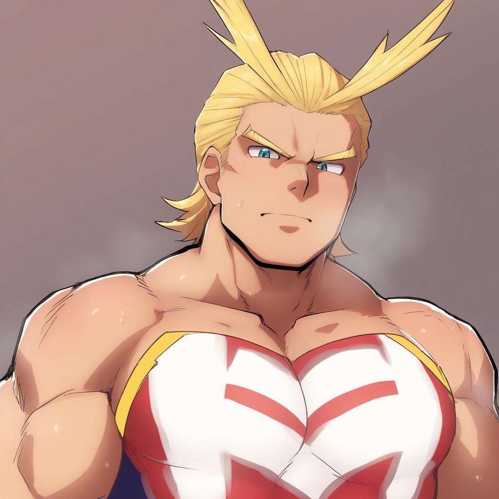 All might, boku no hero academia, 1boy, blue eyes, blonde hair, short hair, antenna hair, hair slicked back, superhero costume, muscular male, large pectorals, bara, superhero costume, by artist ayagi daifuku, leet