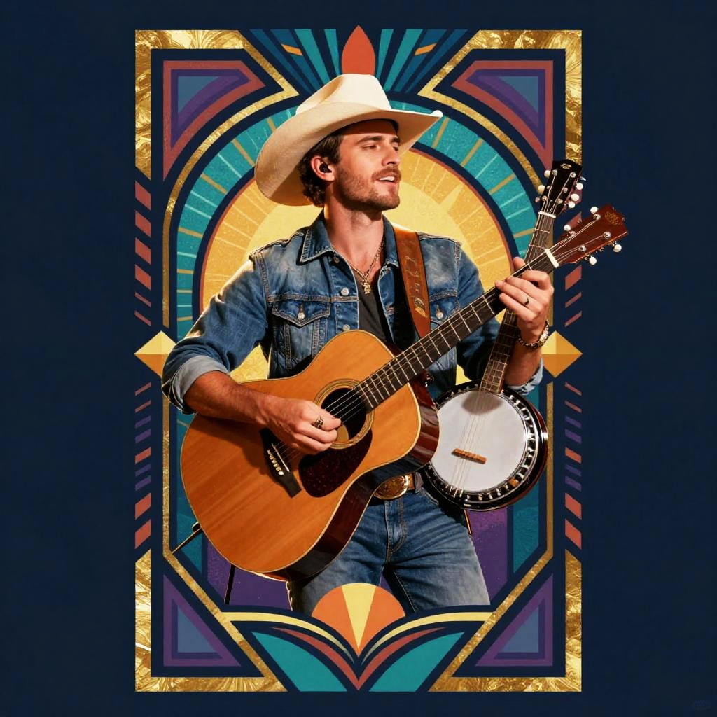Realistic photo.Colorful Art Deco-inspired poster of a country singer strumming guitar, playing banjo, bold geometric patterns, vibrant lighting, and energetic vibe. realistic photo